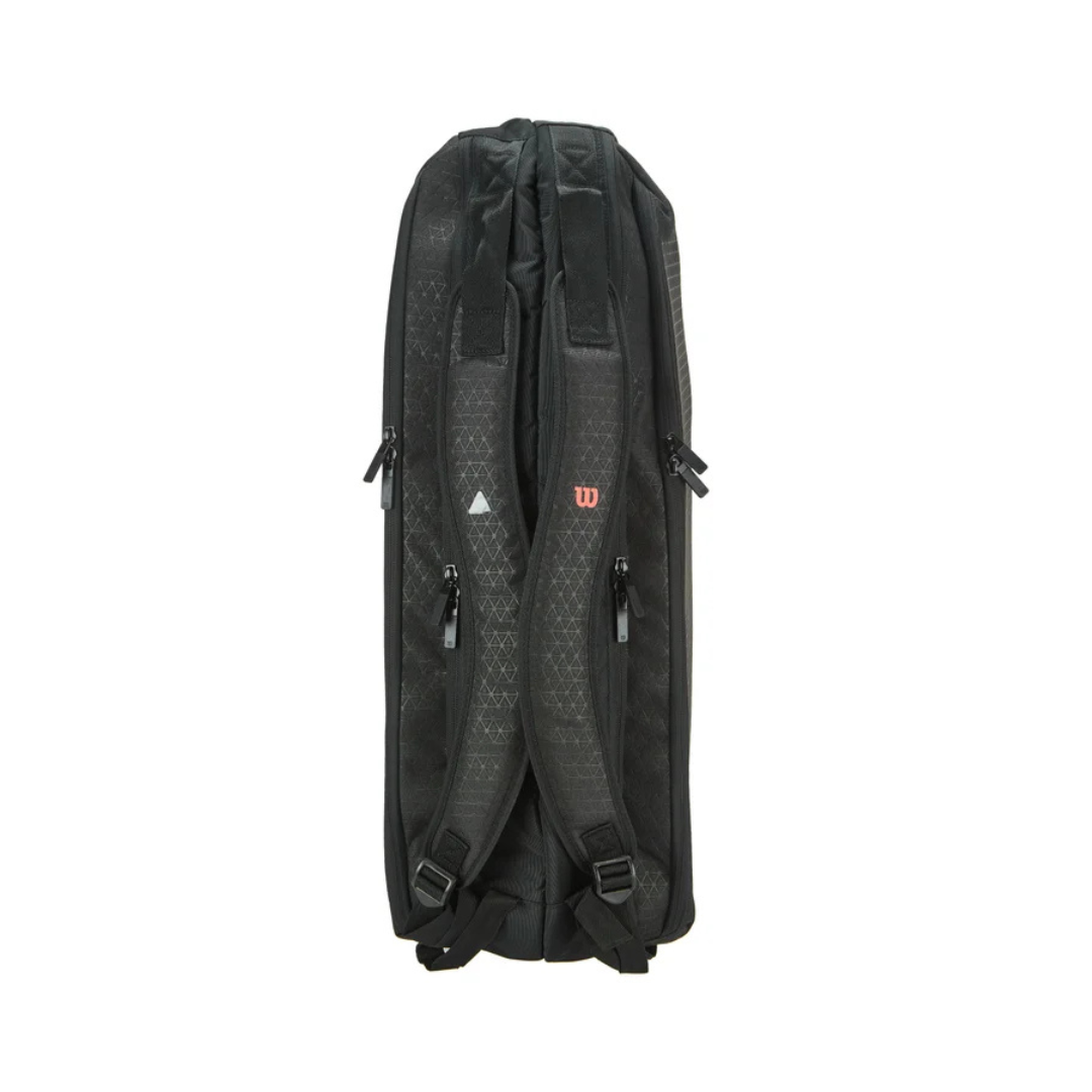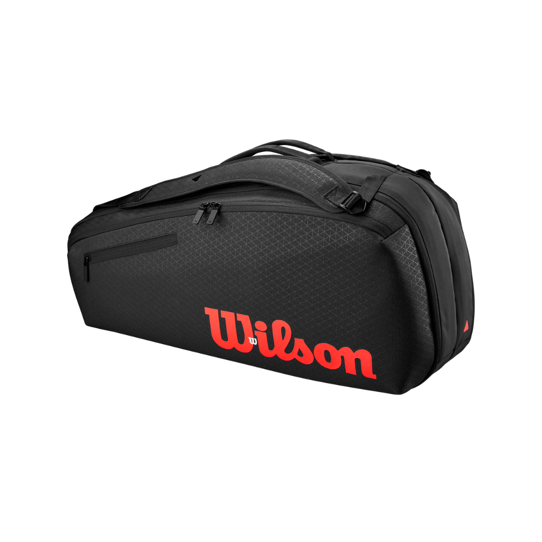 Con el tamaño perfecto para llevar tus artículos esenciales a la cancha, la bolsa Wilson Super Tour Clash v3 6 Pack cuenta con dos compartimentos principales para hasta 6 raquetas y está fabricada con materiales resistentes. Ofrece un amplio espacio para guardar tu equipo de forma organizada, ya que cuenta con un amplio bolsillo para accesorios a ambos lados, además de uno más pequeño para amortiguadores, lija y más. Las correas de hombro son suaves y ajustables, ideales para llevarlas colgadas del hombro o como mochila. Incluso cuenta con un asa de agarre con mosquetón en el extremo para facilitar su colocación en la valla. Creada para la colección Clash, creemos que esta bolsa es perfecta para cualquier raqueta.