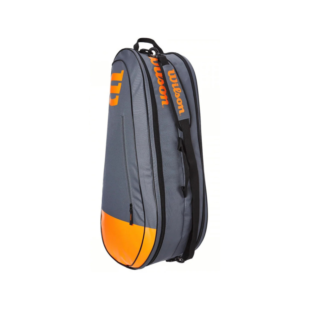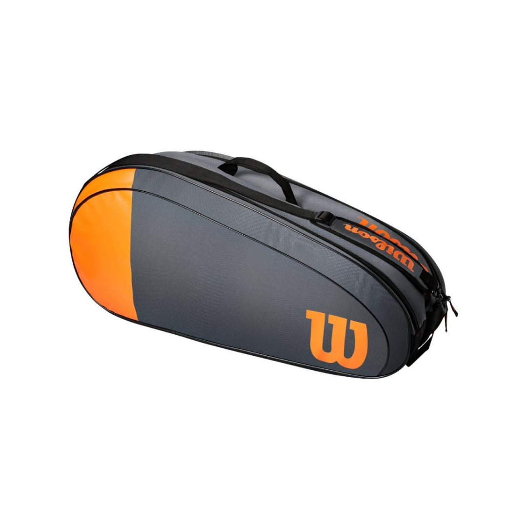 Estuche de tenis Wilson Team 6 PK WR8009801001 : combina una estética elegante con prácticas funciones para jugadores de tenis. Novedad en la línea: bordes lisos que refuerzan la resistencia del tejido de poliéster. Cuenta con dos compartimentos principales con capacidad para hasta 6 raquetas y un bolsillo exterior para accesorios. Correa de hombro ajustable con forro suave y asa superior para facilitar su transporte.